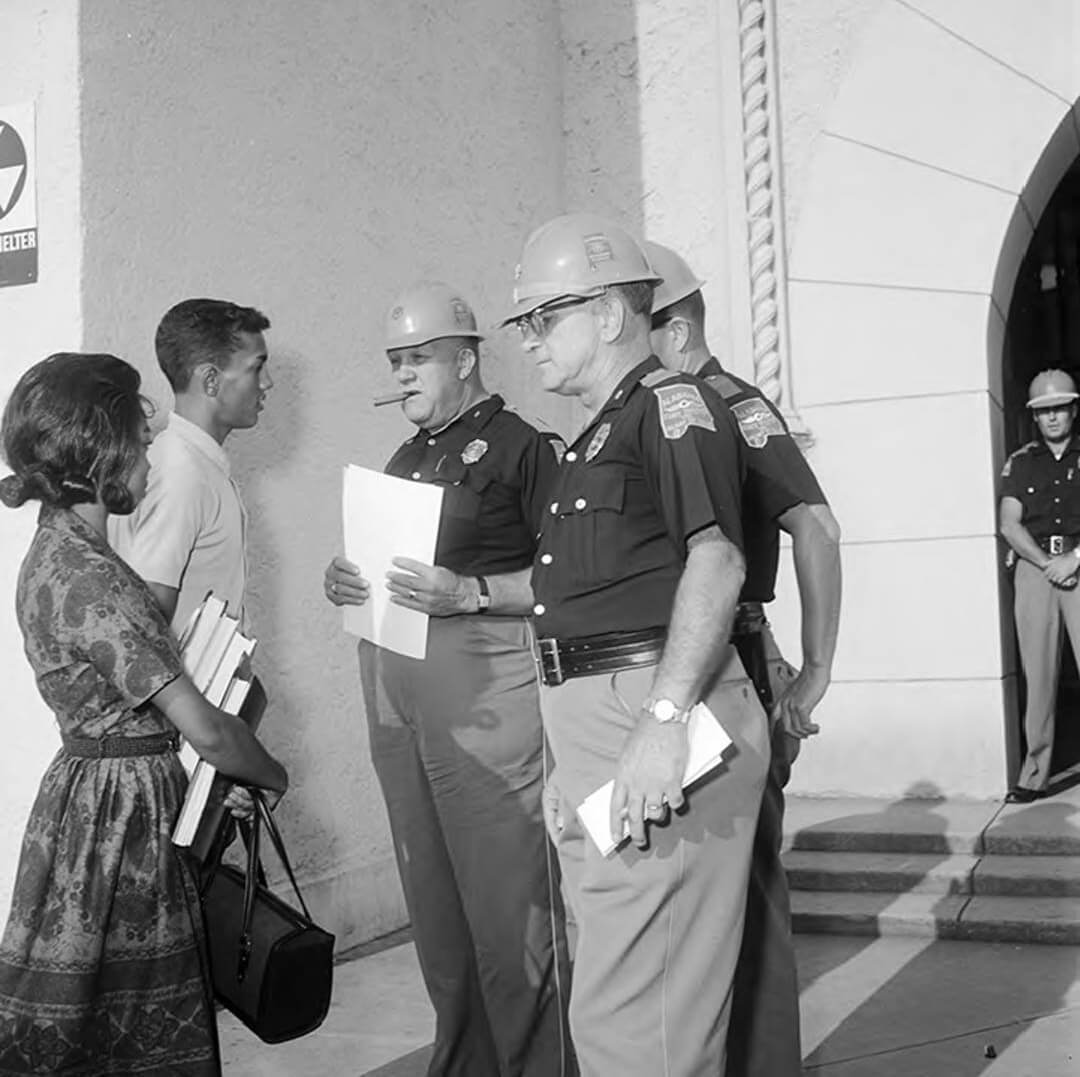 State troopers preventing Henry Hobdy and Dorothy Davis from entering Murphy High School, Mobile, Alabama, September 9, 1963. Photograph by unknown creator. Originally published in the Mobile Press-Register. Courtesy of the Alabama Media Group Collection, Alabama Department of Archives and History.