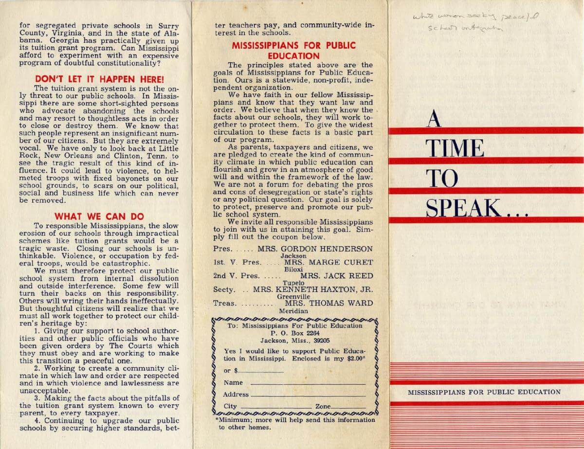 Top and bottom, A Time to Speak, Jackson, Mississippi. Pamphlet by Mississippians for Public Education. Courtesy of the Constance Curry Papers, Stuart A. Rose Manuscript, Archives, and Rare Book Library, Emory University.