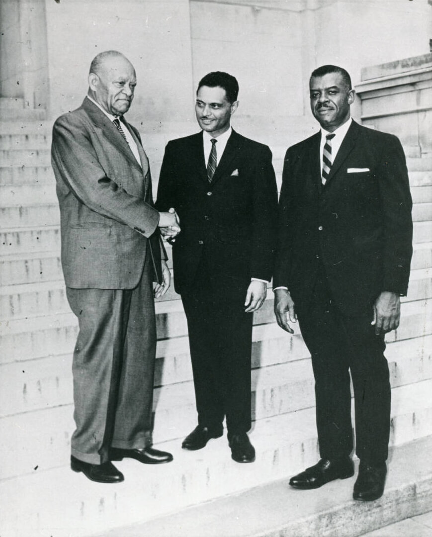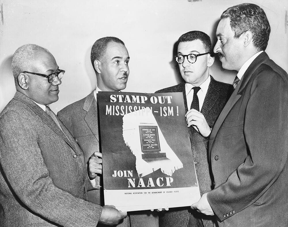 Stamp out Mississippi-ism, Join NAACP, 1956. Photograph by Al Ravenna. From left: Henry L. Moon, director of public relations; Roy Wilkins, executive secretary; Herbert Hill, labor secretary, and Thurgood Marshall, special counsel. Courtesy of the Library of Congress Prints and Photographs Division, loc.gov/pictures/item/99401448.