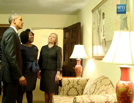 Top, US marshals escort Ruby Bridges at William Frantz Elementary School, New Orleans, Louisiana, November 14, 1960. Photograph by unknown creator. Courtesy of Wikimedia Commons. Bottom, Ruby Bridges and President Barack Obama discussing Norman Rockwell's "The Problem We All Live With" painting, Washington, DC, July 15, 2011. Video still by Executive Office staff. Courtesy of Wikimedia Commons. Images are in public domain.