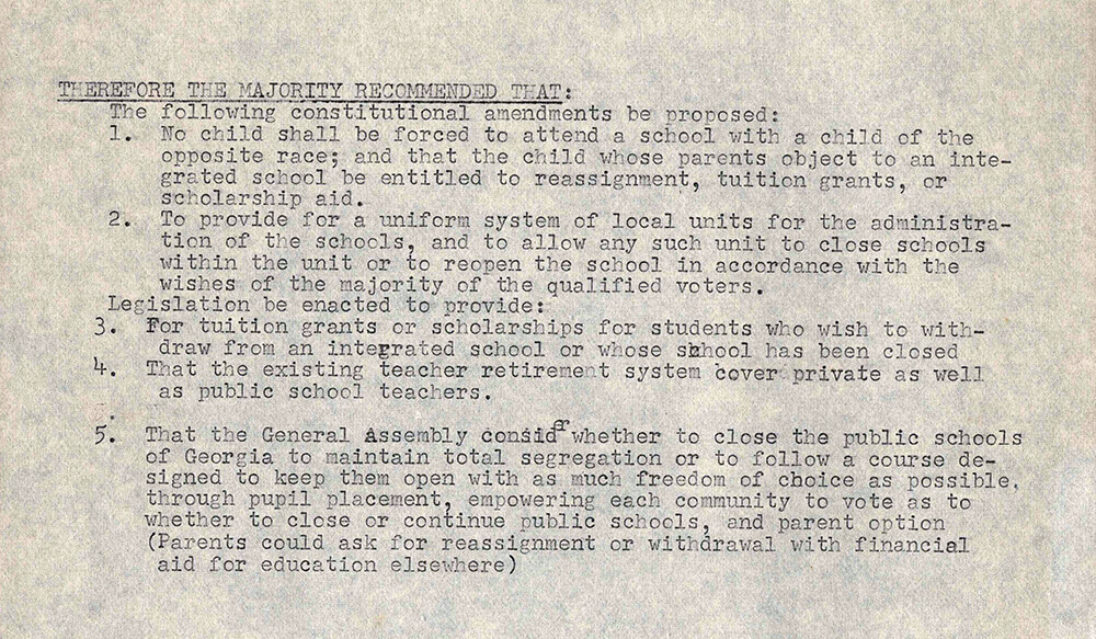 From 1954 to 1965, southern legislatures enacted as many as 450 laws and resolutions attempting to discredit, block, postpone, limit, or evade school desegregation. A large number of these acts allowed the re-direction of public resources, including school resources, to benefit private schools.25Tom Flake, "475 Legislative Actions Pertain to Race, Schools," Southern School News, May 1964, B-1. In 1956, the Georgia legislature permitted the leasing of public property to segregated private schools. Five years later, the state enacted a law to provide vouchers for students to attend any non-sectarian private school, boldly declaring the act was to advance "the constitutional rights of school children to attend private schools of their choice in lieu of public schools."26For a full treatment of the methods and strategies of resistance, including diverting public resources to private schools, see Thomas V. O'Brien, The Politics of Race and Schooling: Public Education in Georgia, 1900–1961 (Lanham, MD: Lexington Books, 1999), 99–198.