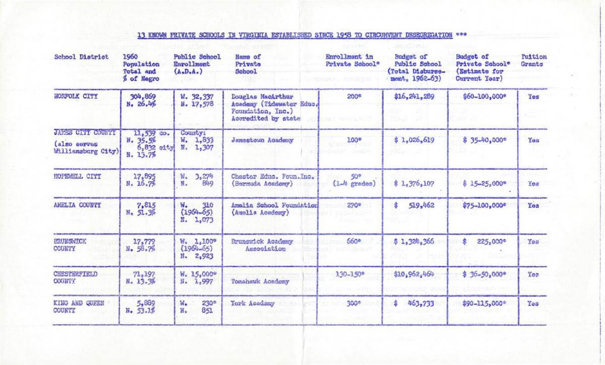 In the same year, Florida governor LeRoy Collins successfully opposed a legislative initiative to pass a constitutional amendment to allow state tax credits for private school contributions. In Prince Edward County and other locations in Virginia, officials used both direct payments and tax credits to build private schools until the federal courts halted both. In Mississippi, after federal courts struck down a direct tuition grant to private schools, Governor John Bell Williams proposed a state tax credit as he searched for the "ways and means of rendering assistance" for white flight to private schools.29"May Veto Plan To Sell Segregation," Daily Defender, June 8, 1959; Lester Tanzer, "Private School Push: Integration of Virginia Public Schools Spurs Growth of Private Units Norfolk Academy, Others Will Expand; State Aids Shift, Authorizes Tuition Grants A Pattern for Solid South? Private School Push: Integration in Virginia Spurs Growth of Units," Wall Street Journal, February 6, 1959; Raymond Moley, "Children Are the Real Victims of the School Integration War," Los Angeles Times, May 18, 1961; Jon Nordheimer, "Integration Raises the Issue of Coeducation in South," New York Times, June 4, 1970.
