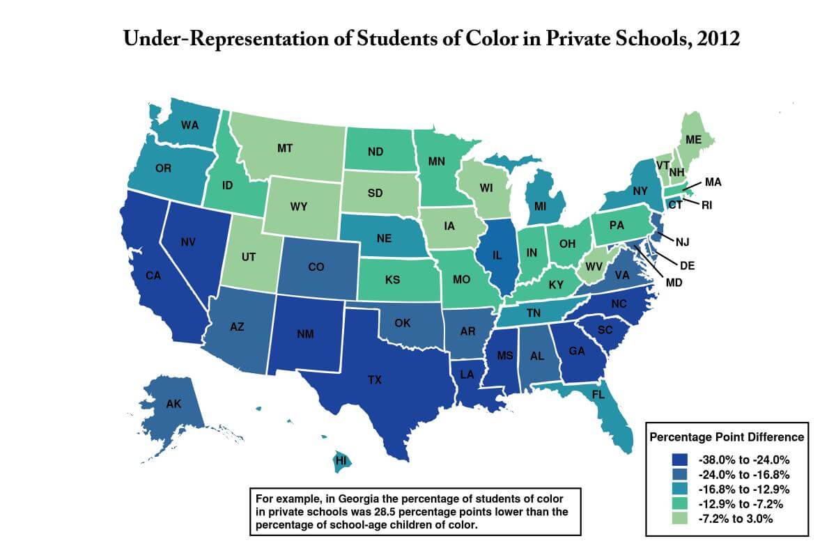 138. Suitts, Race and Ethnicity in a New Era of Public Funding of Private Schools, 28. The two states with the largest percentage of Asian and Pacific Islander school-age children, Hawaii and Alaska, have an under-representation of these children in private schools—in fact, the largest gaps among the 50 states in 2012.