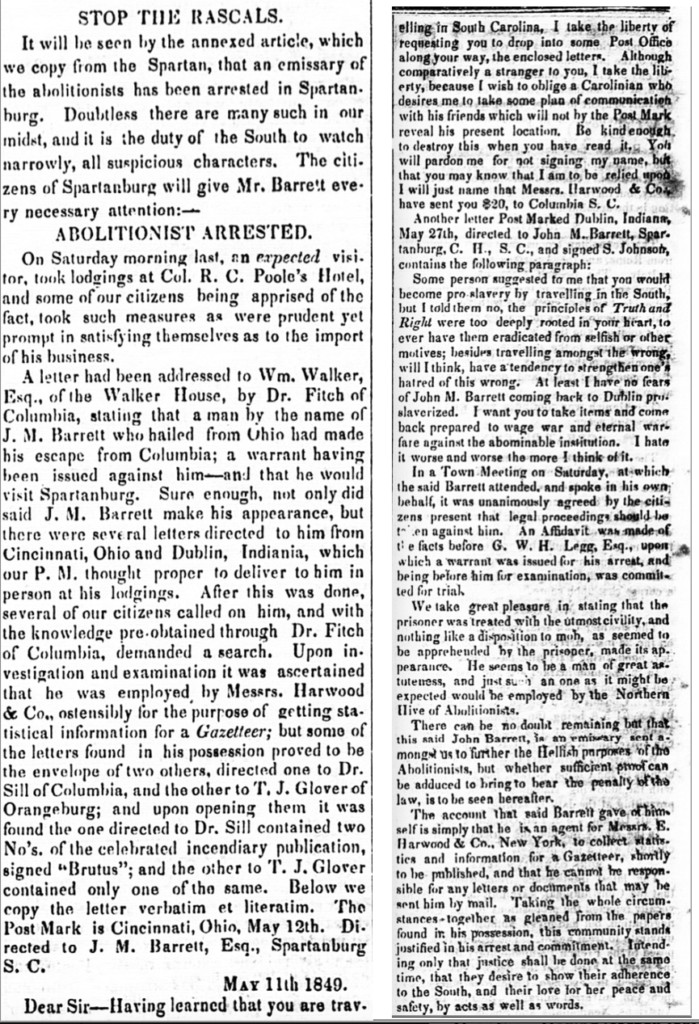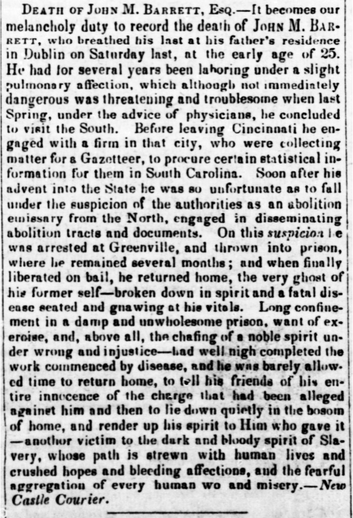 ". . . [he was] collecting matter for a Gazetteer, to procure certain statistical information for them in South Carolina. Soon after his advent in the State, he was so unfortunate as to fall under the suspicion of the authorities as an abolition emissary from the North, engaged in disseminating abolition tracts and documents. On this suspicion, he was arrested at Greenville and thrown into prison, where he remained for several months. When finally liberated on bail, he returned home, the very ghost of his former self-broken down in spirit and a fatal disease seated and gnawing at his vitals."36"Death of John M. Barrett, Esq.," New Castle (IN) Courier, reprinted in Indiana State Sentinel (Indianapolis), April 11, 1850.