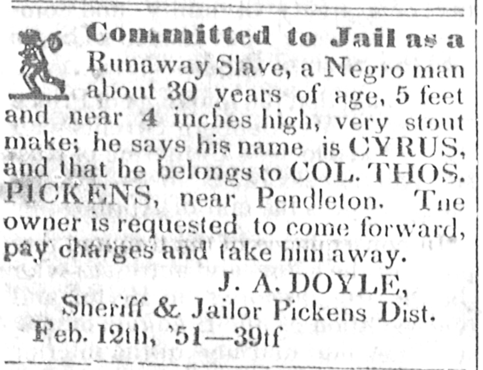 Of course, that message was mixed: white townspeople were kicking up a fuss about a cultural force that had escaped their control. And as they railed against antislavery mail, perhaps it encouraged some Black villagers to self-liberate. Cyrus, for one, enslaved at a labor camp near Pendleton, escaped in 1851.52"Committed to Jail as a Runaway," Pickens Keowee (SC) Courier, February 15, 1851. Although recaptured, he clearly had decided he wouldn't wait for someone to intervene on his behalf.