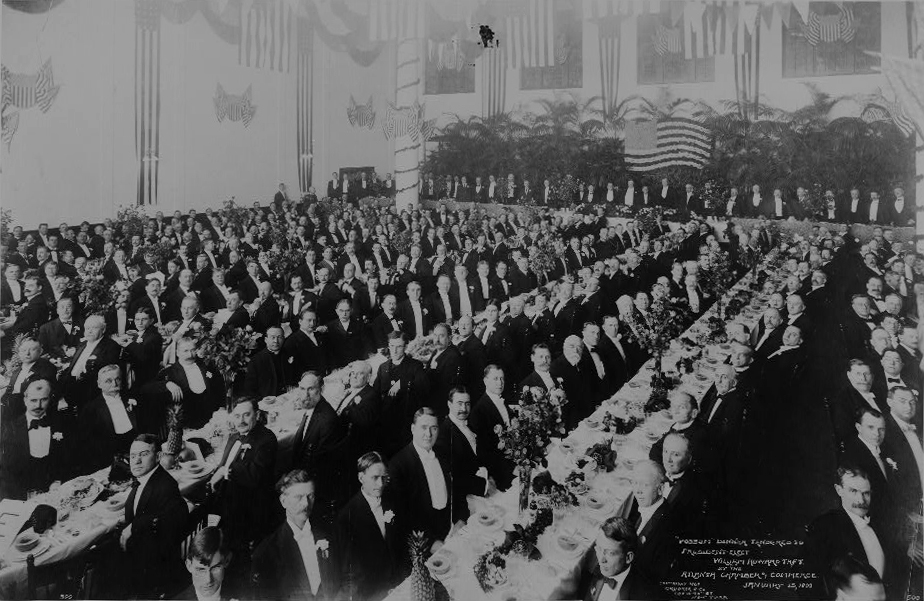 The banquet menu required careful tailoring. So did Taft's speech. To his white male Atlanta audience, Taft pledged, "I shall become the president, not of a party, but of a whole united people," reinforcing his aim to solidify white northerners and southerners.114"How New York Papers View 'Possum Banquet," The Atlanta (GA) Constitution, Jan. 18, 1909, 2. Some questioned Taft's motives, with South Carolina Senator Benjamin Tillman warning in August 1909 that "southerners should beware of Taft spreading molasses to give 'hungry office-seekers an excuse for deserting the democratic party. . . .'"115Needham, "William Howard Taft, The Negro, and the White South, 1908–1912," 96. Yet, Taft's participation in the banquet was a signal of his tolerance—and tacit support—of the Jim Crow laws enacted to maintain social control. Several months after the Atlanta event, Taft would address another white audience at a banquet in Birmingham, Alabama, claiming that he "would not have the South give up a single one of her noble traditions."116William Howard Taft, "Speech at the Chamber of Commerce Banquet, Birmingham, Ala. (November 2, 1909)," Presidential Addresses and State Papers (New York: Doubleday, Page & Company, 1910), 402, https://archive.org/details/presidentialaddr00unit/page/402/mode/2up?view=theater&q=traditions. Taft would prove to be a consistent ally of conservative whites, giving them a free hand, enabling "a moratorium on all African American appointees throughout not only the South, but also the North" and thereby transitioning "into a new, even more lily-white era" for Republicans.117Frantz, "Goin' Dixie," 314; 317. As historian David Needham explains, "probably the most visable [sic] effort by Taft toward wooing white southerners was his appointment of independent Democrats to high federal positions" and elimination of Black governmental involvement.118Needham, "William Howard Taft, The Negro, and the White South, 1908–1912," 118.