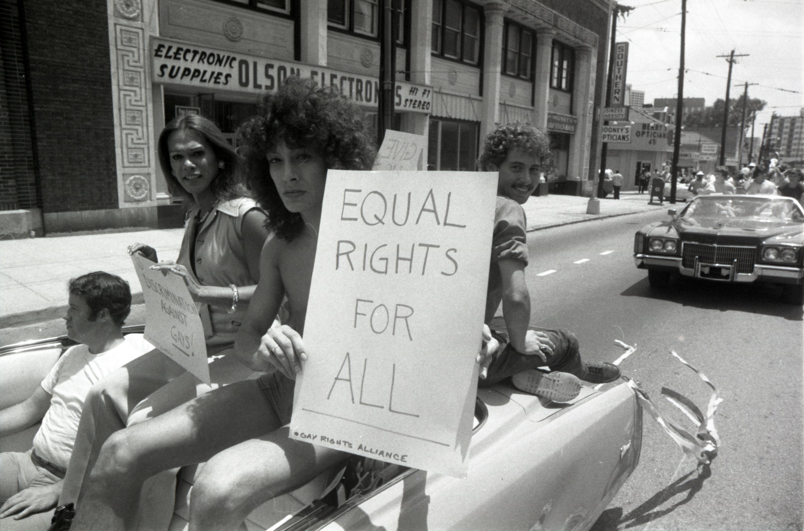 Atlanta Gay Rights Alliance and others leading the Pride parade, Atlanta, Georgia, June 27, 1977. Atlanta-Journal Constitution courtesy of Georgia State University Library.