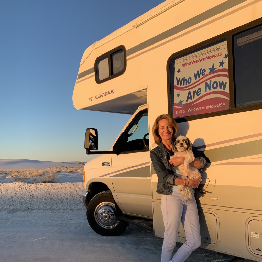 Michelle Fishburne and her dog Buddy outside of their RV. White Sands National Park, New Mexico. February 2021. Photograph courtesy of author.